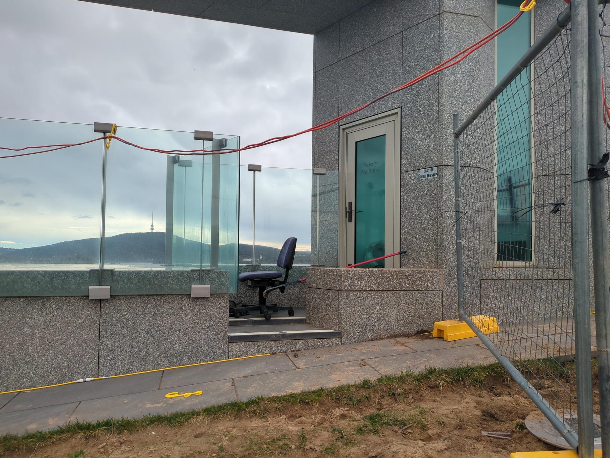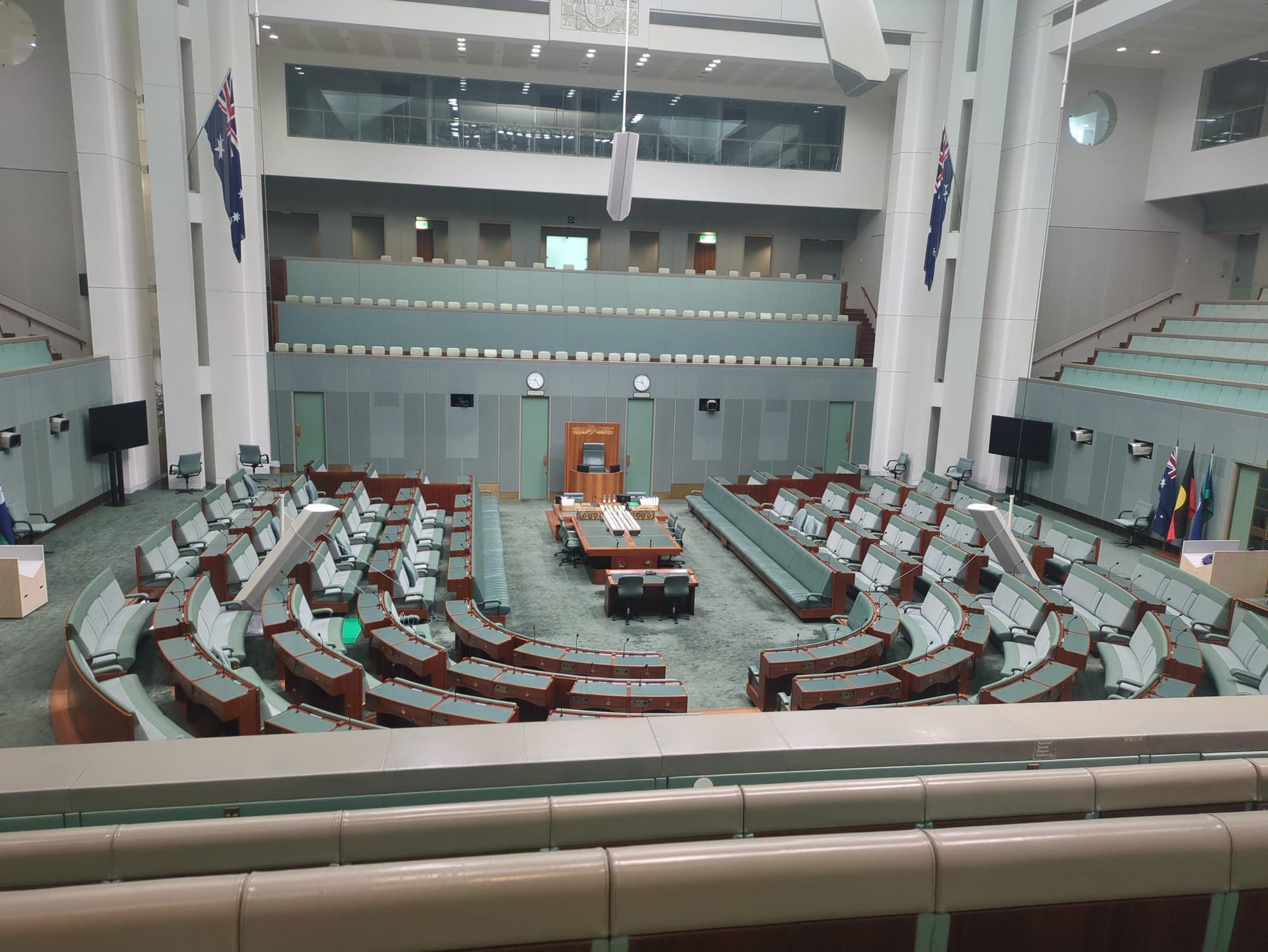 I liked the self-deprecating humour of Pollies Lollies enough to take a photo; it's good to know even the government leaves old chairs outside; the empty House of Representatives chamber